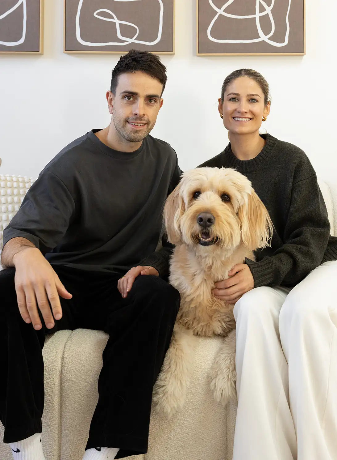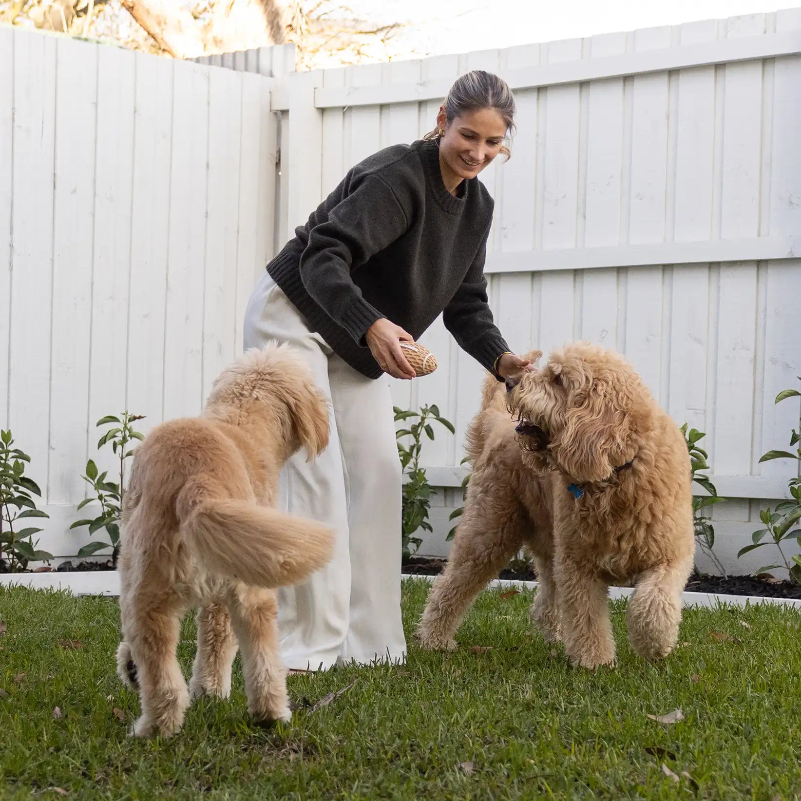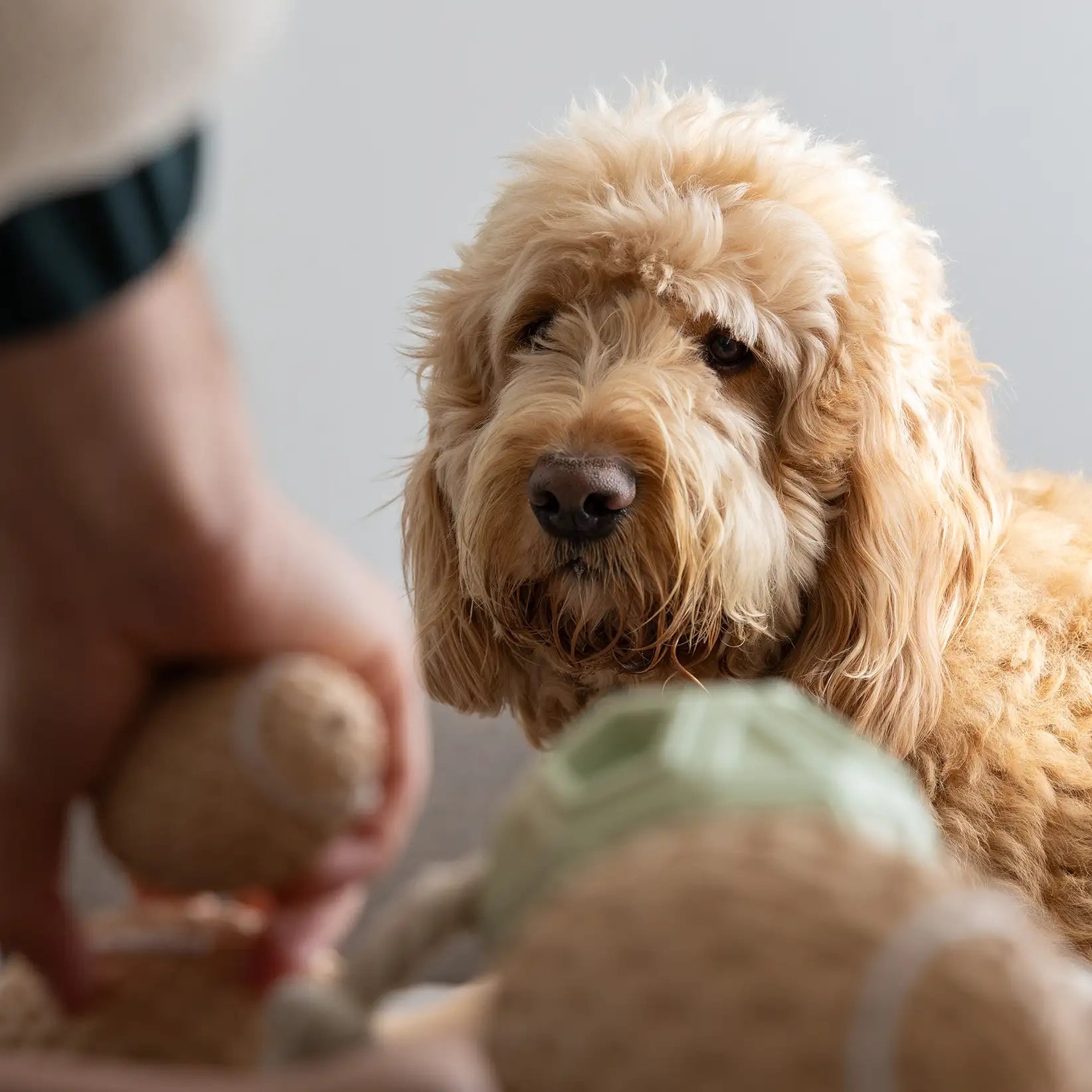 We’re Cassie and Paddy, partners in life and business who are completely obsessed with our Oodles Tex and Hughie. Inspired by their energy, intelligence and love for play, we set out to create toys that could keep up with them while still looking beautiful in the home.